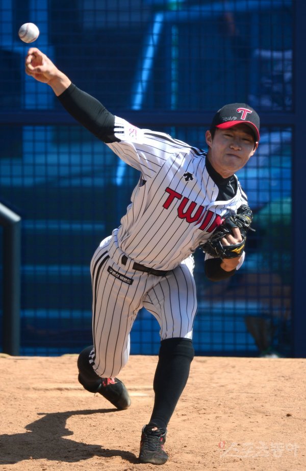 프로야구 개막이 잠정 연기된 가운데 LG 트윈스가 9일 서울 잠실야구장에서 훈련을 가졌다. 이상규가 불펜 투구를 하고 있다.