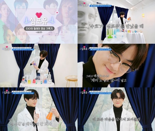 공개된 티저 영상 속 수호는 흰 가운과 안경을 장착하고 깊은 고민에 빠져 있다. 수호는 “수호가 ‘심포유’를 만났을 때”라며 테이블 위에 펼쳐진 유리병 속 색색의 가루들을 하나 둘 모으기 시작한다. 솔직함부터 귀여움, 재미, 잘생김까지 모두 모은 수호는 “이 모든 마음을 담아서 보여 줄게!”라며 ‘심포유 – 수호 편’을 통해 보여줄 다양한 매력들을 기대케 만든다.