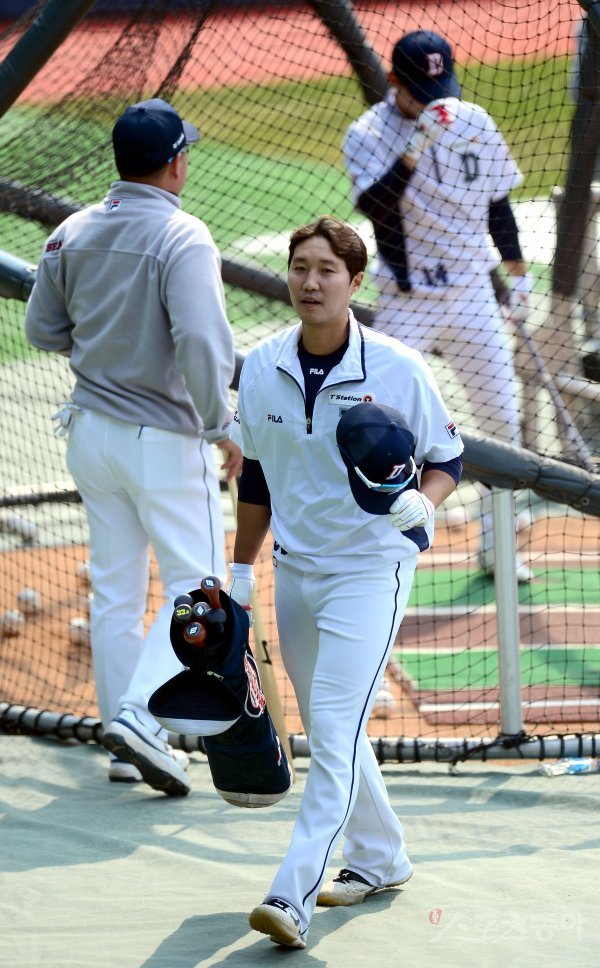 이흥련이 타격 훈련을 마치고 더그아웃으로 향하고 있다.