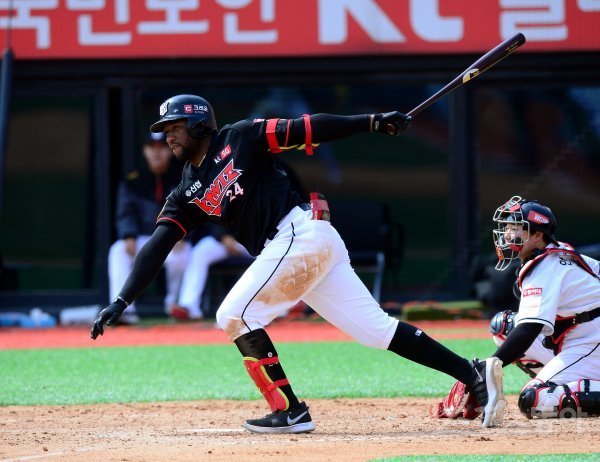 5회초 무사에서 kt 또리팀 로하스가 자가격리 후 첫 청백전에서 안타를 날리고 있다.