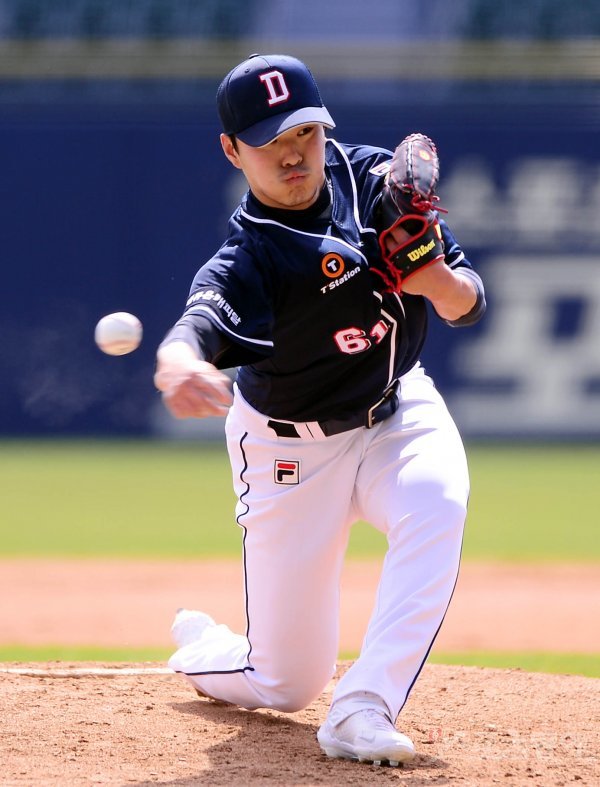프로야구 개막이 연기된 가운데 13일 서울 송파구 잠실야구장에서 두산 베어스가 자체 청백전을 가졌다. 1회말 선발 등판한 청팀 최원준이 역투하고 있다.