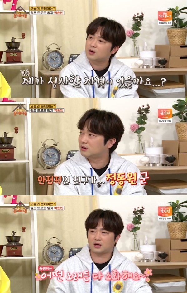 또한, 박현빈은 제2의 박현빈을 꼽아달라는 질문에 ‘트롯 신동’ 정동원을 언급했다. 그는 “가장 안정적인 친구가 정동원이다. 그 친구는 어떤 노래든 다 소화한다. 어린 순수함과 음악성을 당해낼 수가 없다”고 칭찬했다.