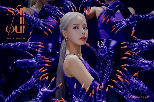 사진 속 솔라는 보라색 의상을 입은 댄서들 사이에서 만개한 꽃처럼 화려한 미모로 눈길을 사로잡는다. 신비로운 보라색 의상과 상큼한 오렌지색 네일팁이 황홀하고 화려한 분위기를 자아내며, 첫 티저부터 강렬함을 선사한다.