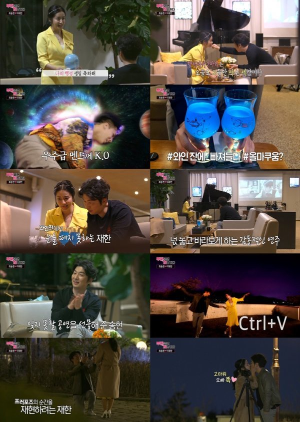 최송현은 ‘라라랜드’ OST를 피아노로 직접 연주, 완벽한 이벤트를 선물했다. 이재한은 “이렇게 행복해도 되는지 모르겠다”며 벅찬 감동을 전했다. 이재한 역시 프러포즈의 순간을 재연하며 최송현에게 팔찌를 선물, 천생연분 커플다운 훈훈함을 자아냈다.