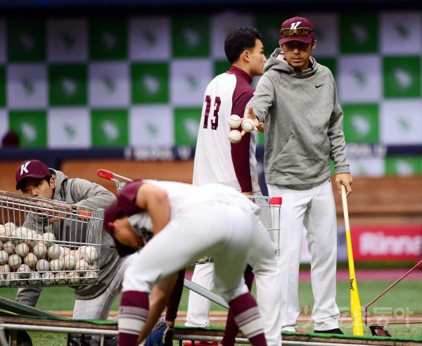 프로야구가 4월 21일 이사회를 통해 개막일을 확정할 것으로 알려진 가운데 15일 서울 구로구 고척스카이돔에서 키움 히어로즈가 자체 청백전에 앞서 훈련을 가졌다. 키움 손혁 감독이 선수들의 훈련이 끝난뒤 뒷정리를 하고 있다.