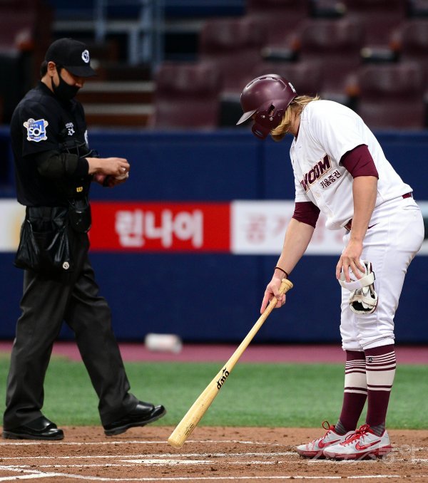 2회말 2사 1, 2루 홈팀 모터가 헛스윙 삼진아웃을 당한 뒤 심판에게 볼판정에 대해 물어보고 있다.