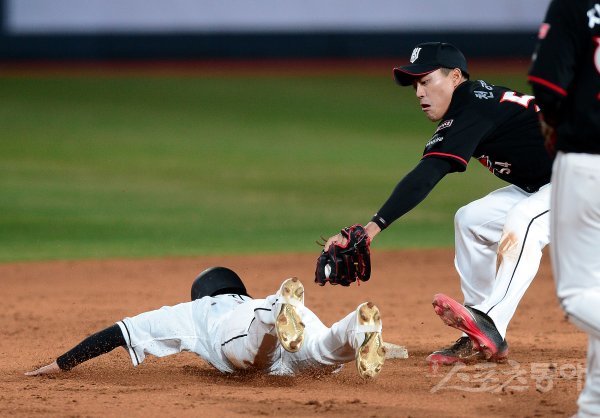7회초 2사 2루에서 kt 빅팀 김병희의 내야 땅볼 때 2루 주자 또리팀 임지한이 귀루하다 천성호에게 태그 아웃되고 있다.