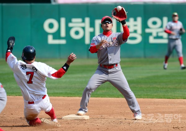 5회말 무사 1루에서 SK 수펙스팀 노수광의 내야 땅볼 때 퓨처스팀 김성현이 1루 주자 정현을 포스 아웃시키고 있다.