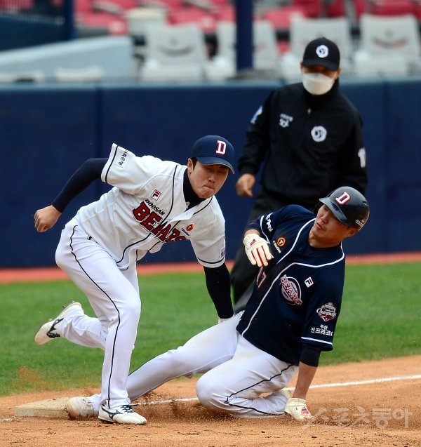 프로야구 개막이 잠정 연기된 가운데 두산 베어스가 19일 서울 잠실야구장에서 자체 청백전을 가졌다. 4회초 무사 2루 상황에서 2루주자 류지혁이 3루 도루에 성공하고 있다.