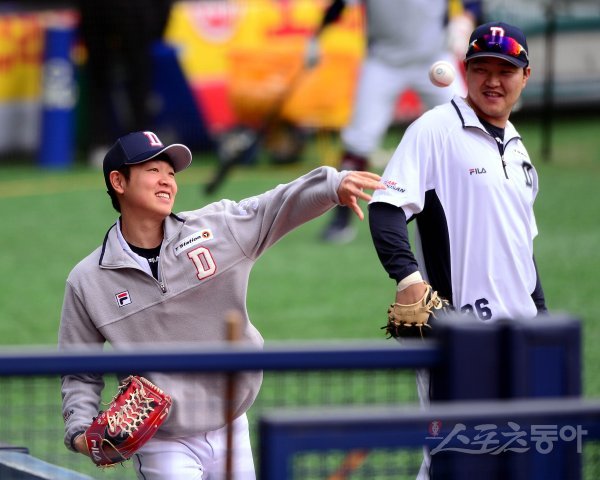 20일 서울 송파구 잠실야구장에서 두산 베어스가 훈련을 가졌다. 두산 정수빈(왼쪽)과 오재일이 캐치볼 중 밝게 웃고 있다.