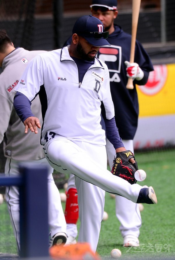 20일 서울 송파구 잠실야구장에서 두산 베어스가 훈련을 가졌다. 두산 알칸타라가 훈련 전 더그아웃 앞에서 공으로 제기차기를 하고 있다.