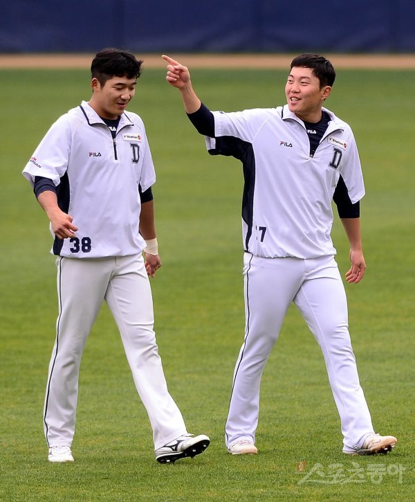 20일 서울 송파구 잠실야구장에서 두산 베어스가 훈련을 가졌다. 두산 류지혁이 주루 훈련 중 김대한과 장난을 치고 있다.