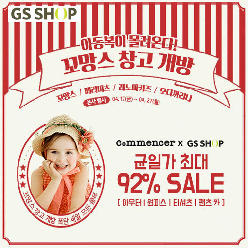 GS샵이 27일까지 아동복 브랜드 꼬망스의 창고 개방 행사(사진)를 진행한다. 신종 코로나바이러스 감염증(코로나19) 사태로 모바일 GS샵에서 여는 비대면 패밀리세일 행사다. 꼬망스는 물론 페리미츠, 레노마키즈, 모다까리나 브랜드의 이월상품을 최대 92% 할인가에 판매한다. 아우터, 원피스, 티셔츠, 바지 등 다양한 아동복 라인으로 구성했다.