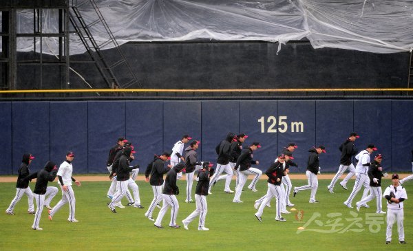 20일 서울 송파구 잠실야구장에서 LG 트윈스가 훈련을 가졌다. LG 선수들이 비를 맞으며 외야에서 몸을 풀고 있다.