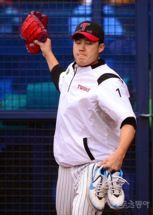 20일 서울 송파구 잠실야구장에서 LG 트윈스가 훈련을 가졌다. LG 임찬규가 불펜에서 신발과 글러브를 들고 투구폼을 취하고 있다.