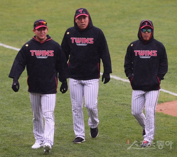 20일 서울 송파구 잠실야구장에서 LG 트윈스가 훈련을 가졌다. LG 김민성, 김현수, 정근우(왼쪽부터)가 비로 인해 훈련이 중단되자 더그아웃으로 들어가고 있다.