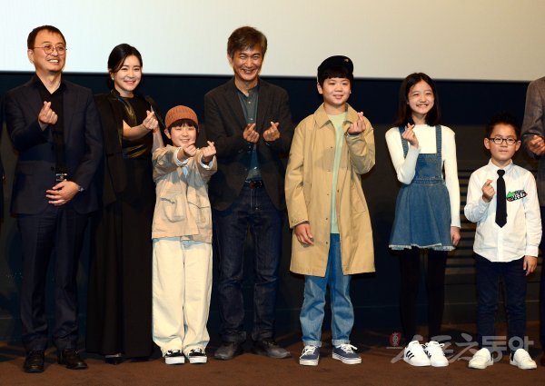 최종태 감독, 이항나, 이경훈, 안내상, 정상현, 이슬비, 김동화(왼쪽부터)가 20일 오후 서울 용산 CGV아이파크몰에서 열린 영화 ‘저 산 너머’ 언론시사회에 참석해 포토타임을 갖고 있다.
