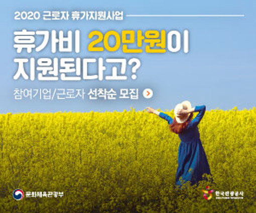 ‘근로자 휴가지원사업’은 기업 휴가문화 개선과 국내여행 활성화를 위해 근로자가 20만 원을 부담하면 기업이 10만 원, 정부가 10만 원의 국내여행 경비를 지원하는 제도다. 최근 코로나19 사태로 인한 경기 침체를 극복하기 위해 추가모집을 결정했다. 특히 기존에 참여 범위를 중소기업, 소상공인 근로자, 비영리민간단체, 사회복지법인·시설 근로자로 제한한 것에서 이번 추가모집에서는 중견기업까지 확대했다.