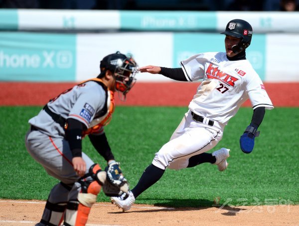 3회말 무사 1루 KT 심우준 2루타 때 1루주자 배정대가 홈까지 달려 세이프 되고 있다.