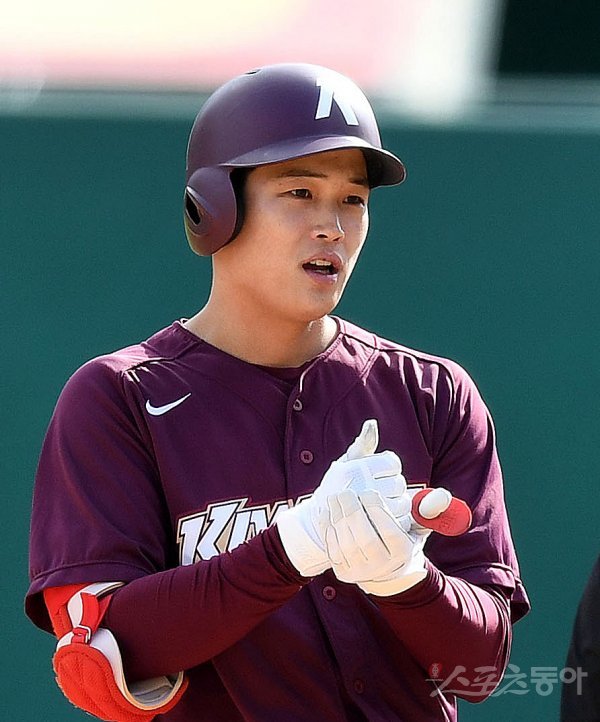 키움 박준태가 2루타를 날린 뒤 ‘의료진 힘내세요’라는 수화를 선보이고 있다.