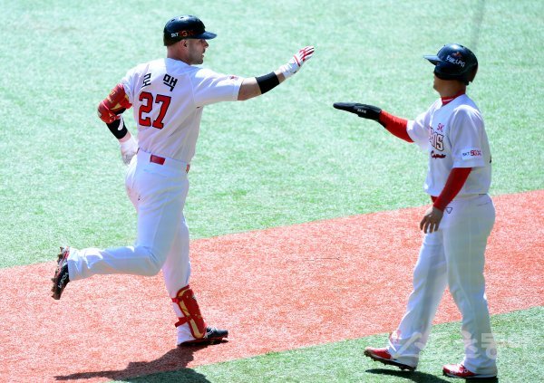 1회말 2사 1루에서 SK 로맥이 투런 홈런을 쏘아 올린 뒤 최정의 환영을 받고 있다.