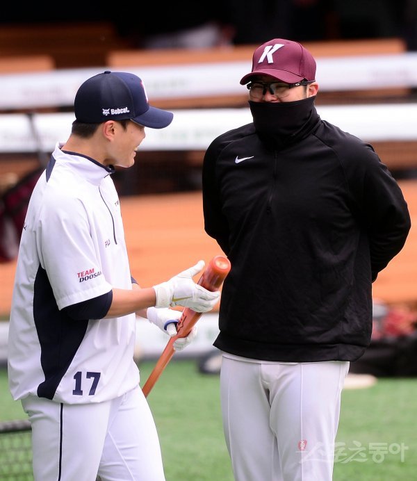 22일 서울 송파구 잠실야구장에서 2020 KBO리그 두산 베어스와 키움 히어로즈의 연습경기에 앞서 훈련을 가졌다. 키움 한현희가 두산 류지혁과 훈련 교대 중 즐겁게 대화하고 있다.
