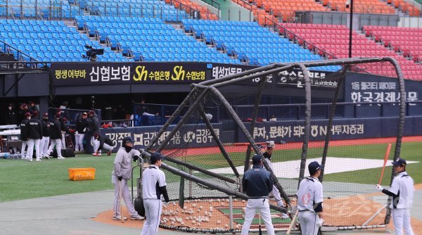 22일 서울 송파구 잠실야구장에서 2020 KBO리그 두산 베어스와 키움 히어로즈의 연습경기에 앞서 훈련을 가졌다. 키움 선수들이 두산의 훈련 종료까지 더그아웃에서 대기하고 있다.