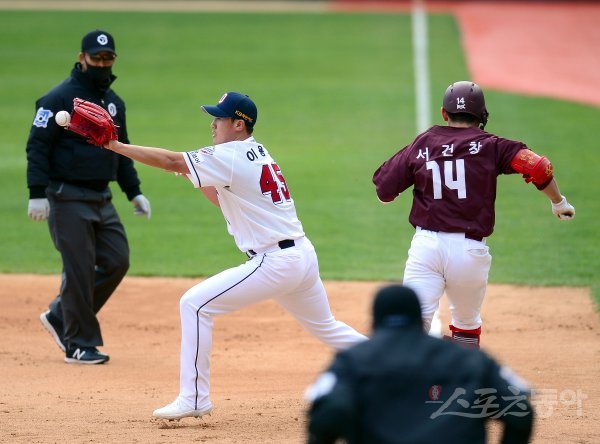 KBO리그가 5월 5윌 개막을 확정지은 가운데 22일 잠실야구장에서 키움 히어로즈와 두산 베어스가 연습경기를 가졌다. 6회초 교체 등판한 두산 이용찬이 키움 서건창 내야 땅볼 때 1루 베이스커버에 들어가 아웃시키고 있다.