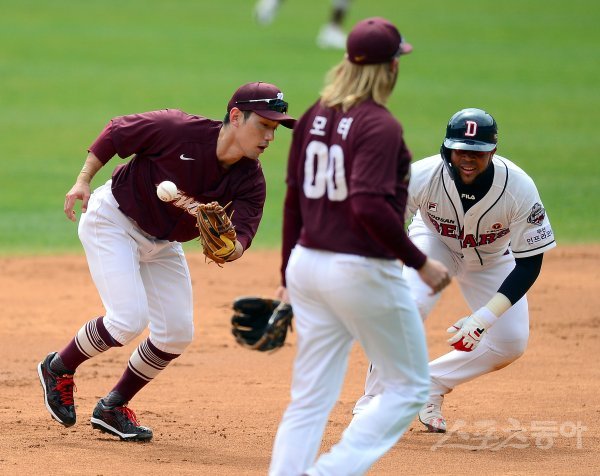 2회말 무사 1루 두산 내야 땅볼 때 키움 서건창이 1루주자 페르난데스를 포스 아웃시킨 후 볼을 놓치고 있다.