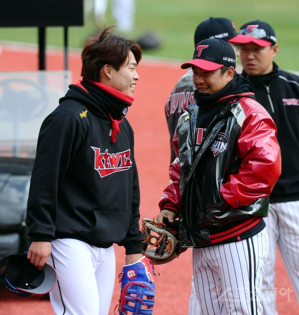 경기에 앞서 kt 강백호와 LG 정근우가 이야기를 나누고 있다.