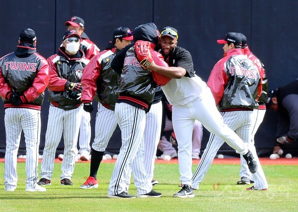 경기에 앞서 kt 로하스가 LG 선수들과 포옹을 나누고 있다.