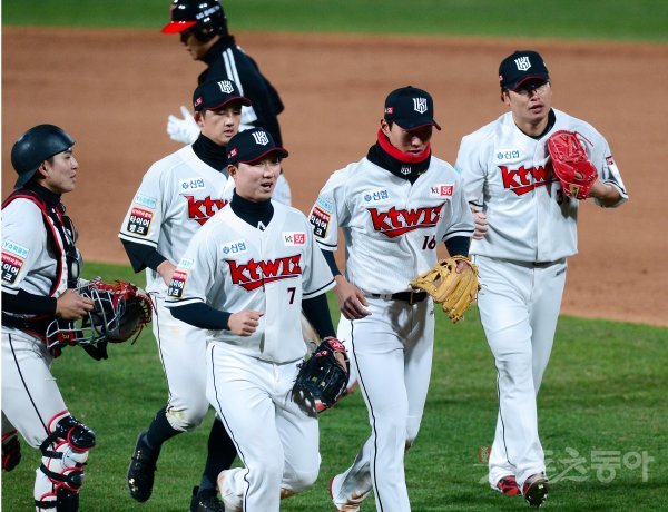 kt가 LG에 10-3으로 승리한 뒤 선수들이 그라운드에서 기쁨을 나누고 있다.