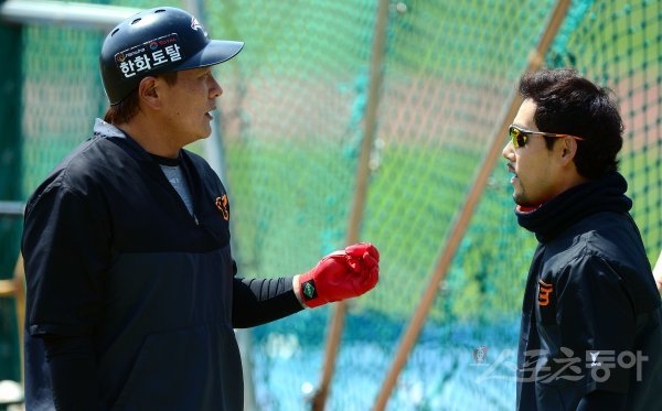 5월 5일 프로야구 개막을 앞두고 23일 대전 한화생명이글스파크에서 한화 이글스와 KIA 타이거즈의 연습경기가 열린다. 경기에 앞서 한화 김태균과 이용규가 이야기를 나누고 있다.