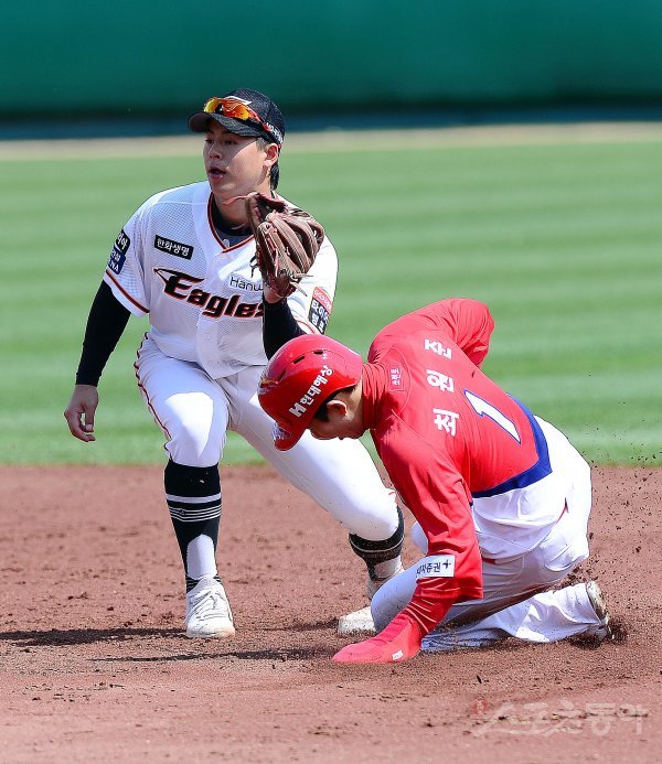 2회초 1사 1루에서 KIA 김선빈 타석 때 1루 주자 최원준이 한화 노시환의 태그를 피해 2루 도루를 성공시키고 있다.