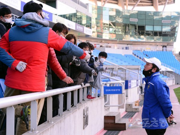 인천 임완섭 감독이 취재진과 거리둔 채 인터뷰하고 있다.