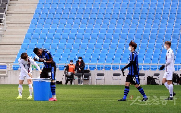 한국프로축구연맹이 지난 21일 팀 간 연습경기를 허용한 가운데 23일 인천축구전용경기장에서 열린 K리그 수원FC와 인천 유나이티드의 첫 연습경기가 열렸다.