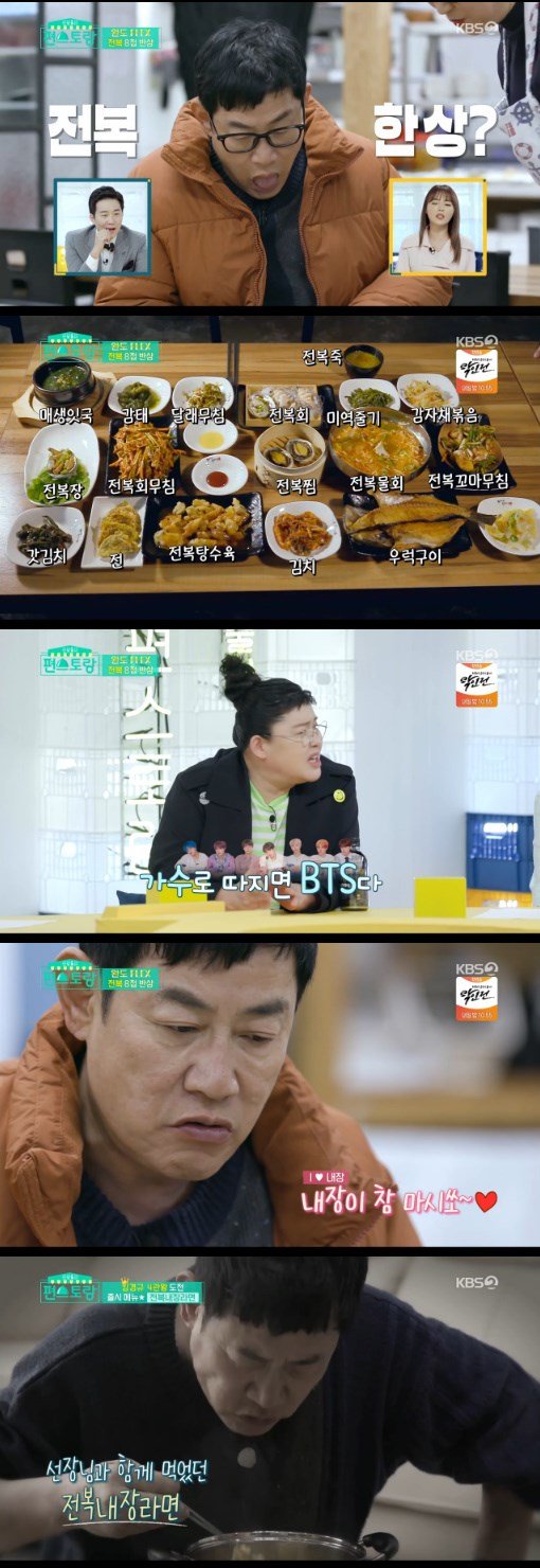 전복으로 만든 여러 음식들이 나오자 모든 이들이 감탄했다. 이영자는 “이런 걸 보면 우리나라가 굉장히 자랑스럽다”라며 “음식계의 방탄소년단이다”라고 말했다.