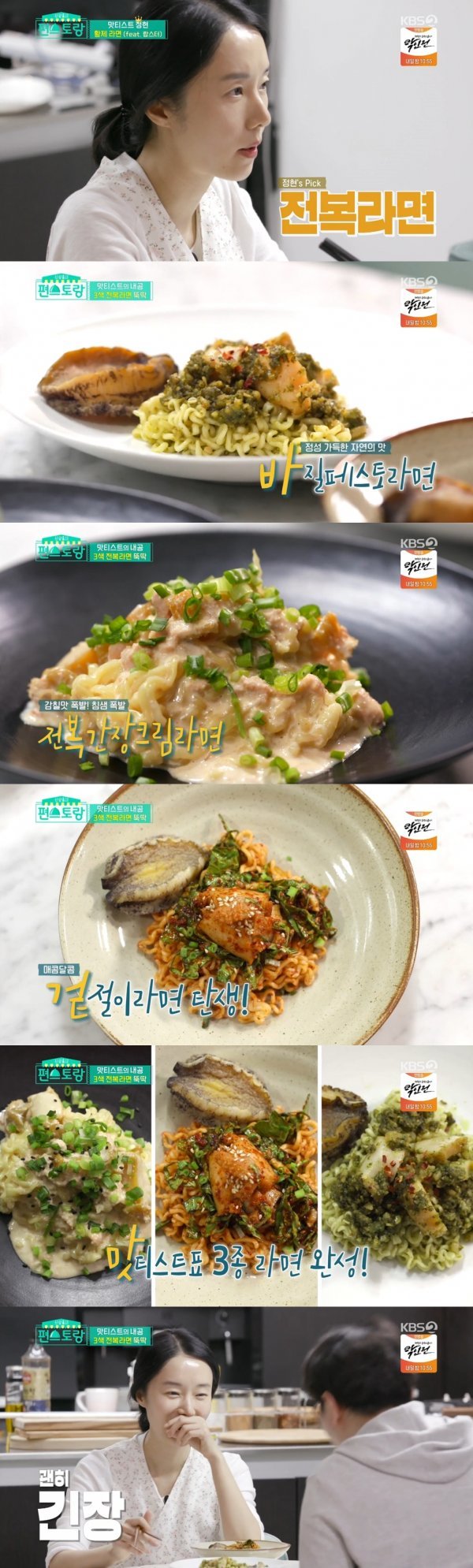 이날 이정현은 남편 베비와 야식을 먹던 중 라면으로 전복 메뉴를 개발하기로 결심했다. 라면이야말로 편의점에서 가장 많이 소비되는 메뉴이기 때문. 단, 맛티스트라는 별명답게 이정현의 라면은 결코 뻔하지 않았다. 이정현은 ‘완도산 전복’을 재료로 바질페스토라면, 전복간장크림라면, 겉절이비빔면 등 3가지 종류의 라면을 만들기 시작했다.