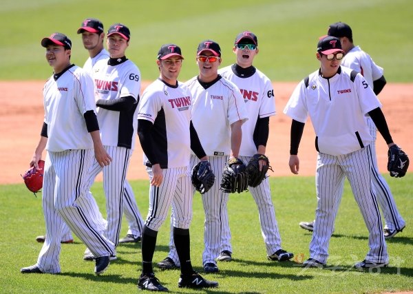 프로야구가 5월 5일 개막을 앞둔 가운데 26일 서울 송파구 잠실야구장에서 LG 트윈스가 훈련을 가졌다. LG 투수조가 수비 훈련 중 코치를 바라보며 웃고 있다.