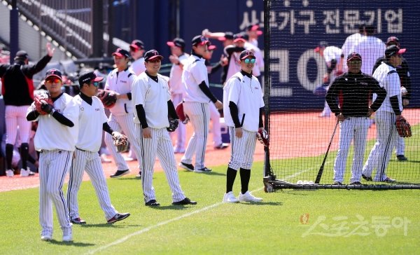 프로야구가 5월 5일 개막을 앞둔 가운데 26일 서울 송파구 잠실야구장에서 LG 트윈스가 훈련을 가졌다. LG 김현수와 박용택이 외야에서 캐치볼을 하던 중 내야를 바라보며 웃고 있다.