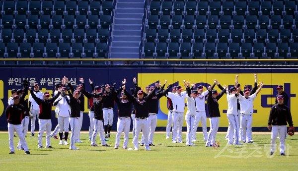 프로야구가 5월 5일 개막을 앞둔 가운데 26일 서울 송파구 잠실야구장에서 LG 트윈스가 훈련을 가졌다. LG 선수들이 외야에서 몸을 풀고 있다.