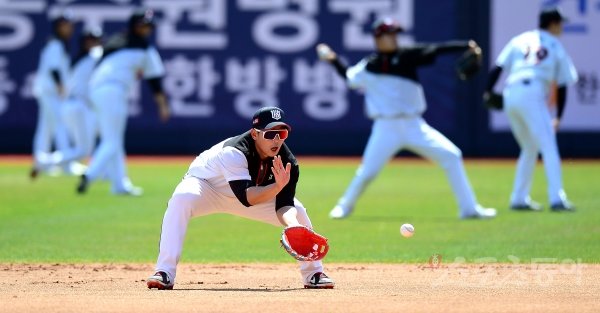 KBO리그가 5월 5일 개막을 확정지은 가운데 26일 수원KT위즈파크에서 KT 위즈가 자체 훈련을 가졌다. 박경수가 수비 훈련을 하고 있다.