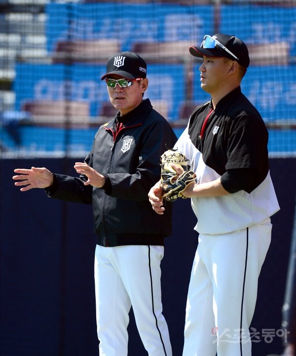 KBO리그가 5월 5일 개막을 확정지은 가운데 26일 수원KT위즈파크에서 KT 위즈가 자체 훈련을 가졌다. 이강철 감독이 장성우와 이야기하고 있다.