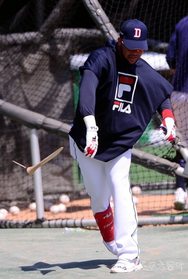 프로야구가 5월 5일 개막을 앞둔 가운데 26일 서울 송파구 잠실야구장에서 두산 베어스가 훈련을 가졌다. 두산 페르난데스가 타격 훈련 중 배트를 부러지자 바닥에 던지고 있다.