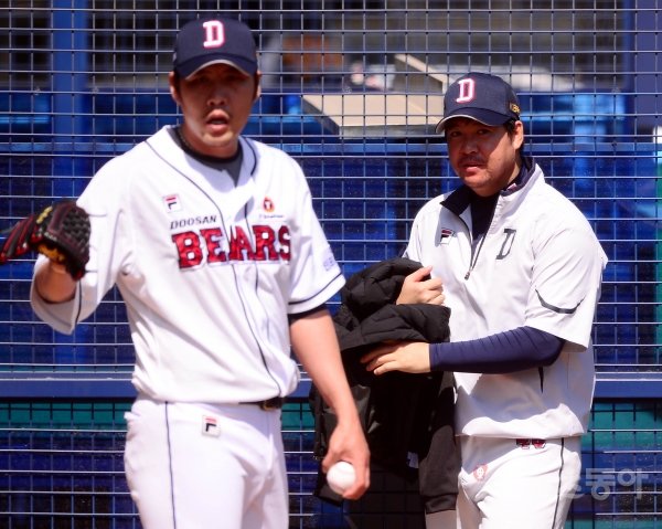 프로야구가 5월 5일 개막을 앞둔 가운데 26일 서울 송파구 잠실야구장에서 두산 베어스가 훈련을 가졌다. 두산 이현승이 불펜 피칭하는 권혁을 지켜보고 있다.