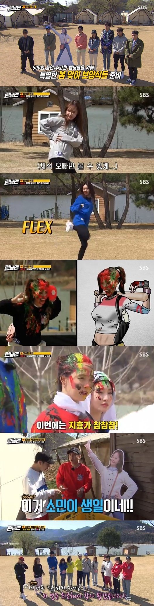 두 번째 미션 ‘지금 구하러 갑니다’에서는 참참참 게임 진행 속도에 따라 멤버들이 물감을 뒤집어쓰며 500회다운 분장개그가 쏟아졌다. 미주는 ‘참참참 게임’을 통해 테크노 여전사에 등극하는가 하면, 이광수는 초유의 재경기까지 하며 ‘물감 괴물’로 변신했다.