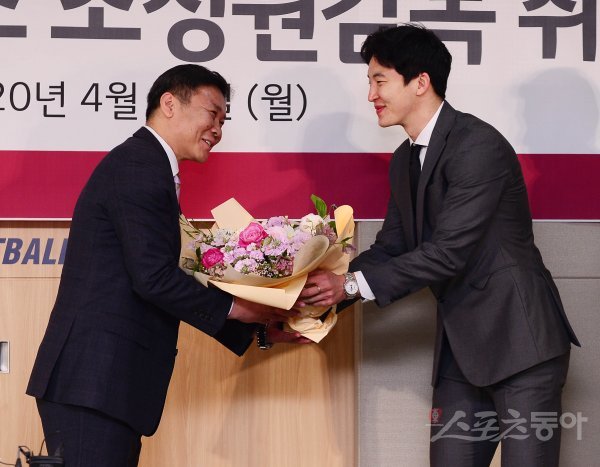 조성원 감독이 27일 서울 강남구 논현동 KBL센터에서 열린 창원 LG 감독 취임 기자회견에서 강병현으로부터 축하 꽃다발을 받으며 웃고 있다.