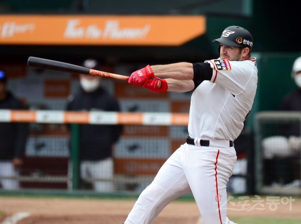1회말 무사 2,3루 한화 호잉이 동점 1타점을 만드는 중전 2루타를 치고 있다.
