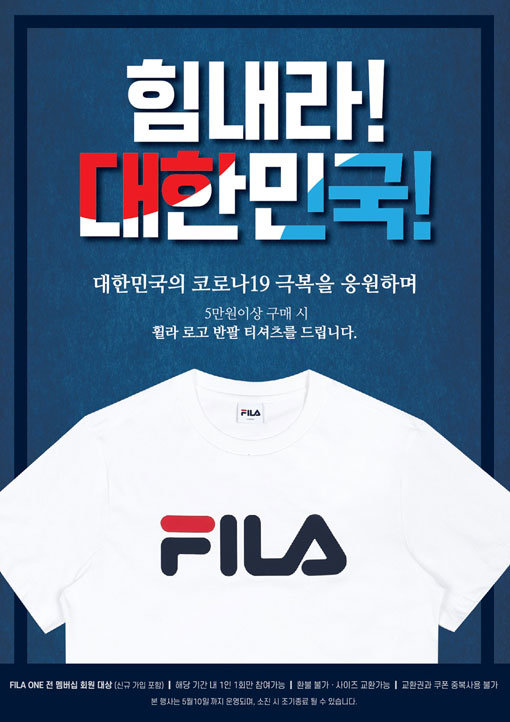 신종 코로나바이러스 감염증(코로나19) 여파로 힘겨운 시간을 보내고 있는 고객들을 응원하기 위해 마련했다. 멤버십 제도인 휠라 원 가입 고객 대상으로 발송된 문자 쿠폰 지참 후 전국 오프라인 매장 및 공식 온라인몰에서 5만 원 이상 제품 구매 시 2만9000원 상당의 ‘휠라 로고 반팔 티셔츠’를 증정한다. 기존 회원은 물론 캠페인 기간 내 신규 가입한 멤버십 회원도 참여 가능하다.