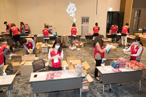 이날 봉사활동에 참여한 롯데월드 직원 20여명은 발열체크 후 마스크와 라텍스 장갑을 착용하고 드림박스를 제작했다. 1.5m씩 거리를 유지한 상태로 진행했으며 소독제를 이용해 선물의 구성품을 하나하나 닦아 상자에 담았다.